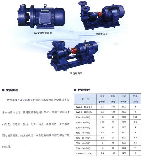 主要用途:W型單級直連旋渦泵是供吸送清水和物理化學性質類似于水的液體之用,使用液溫不得超過60℃,常用于鍋爐給水的配套,在造船、輕紡、化工、冶金、機械制造、水產養殖、固定消防穩壓、熱交換機組、農業遠程噴灌等部門都有廣泛的應用。